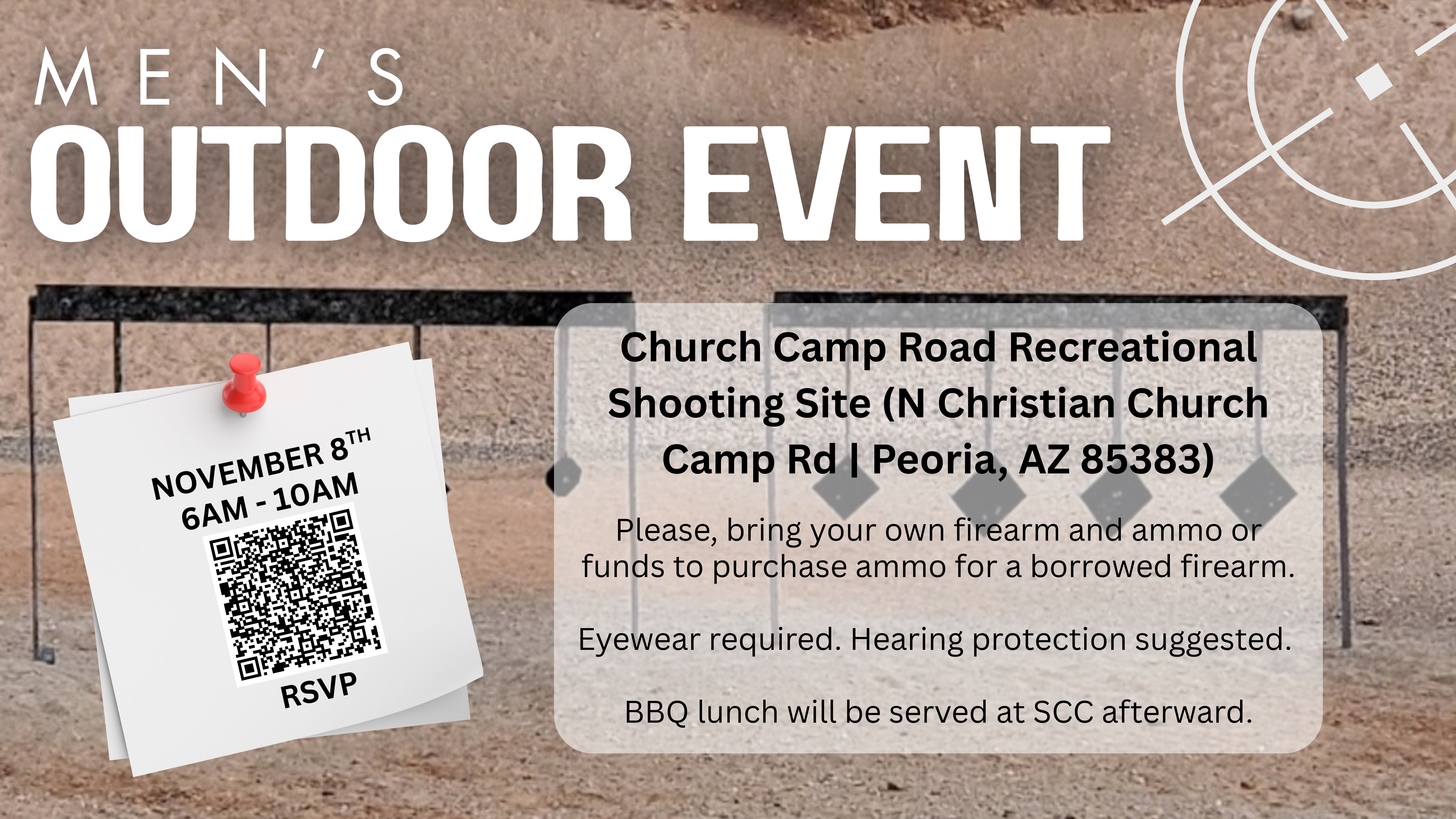 Church Camp Road Recreational Shooting Site (N Christian Church Camp Rd | Peoria, AZ 85383). Please bring your own firearm and ammo or funds to purchase ammo for a borrowed firearm. Eyewear required. Hearing protection suggested. BBQ lunch will be served at SCC afterward. Please RSVP using this link: Click Here
